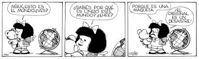 Una buena forma de trabajar este tema es utilizando algunas tiras cómicas de nuestra querida Mafalda. Aquí tenemos un ejemplo sobre el que los alumnos pueden como primera actividad explicar lo que sucede, hacer hipótesis sobre lo que habrá sucedido antes o lo que sucederá después, escribir un final para la historia o incluir más personajes. También se puede tomar como inicio en grupos grandes, para actividades de tipo teatral.