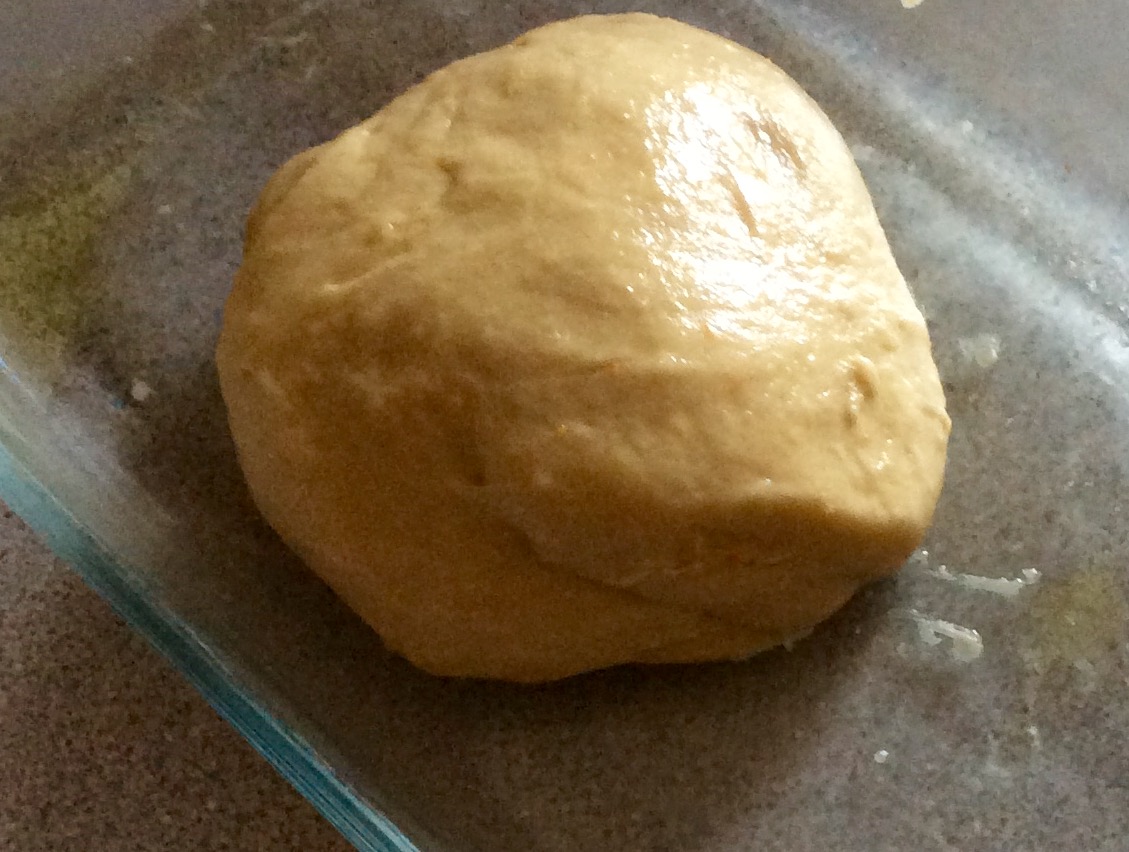 Mezclamos todos los ingredientes excepto la harina con ayuda de una batidora. Después añadimos la harina tamizada previamente y mezclamos hasta formar una bola sólida. Amasamos hasta obtener este resultado: