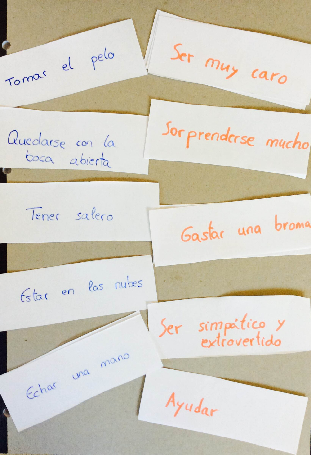 Se puede usar como actividad introductoria a las frases hechas, usando los dos grupos de tarjetas, o como actividad de repaso, usando solo uno de los grupos (tanto el azul como el rojo).